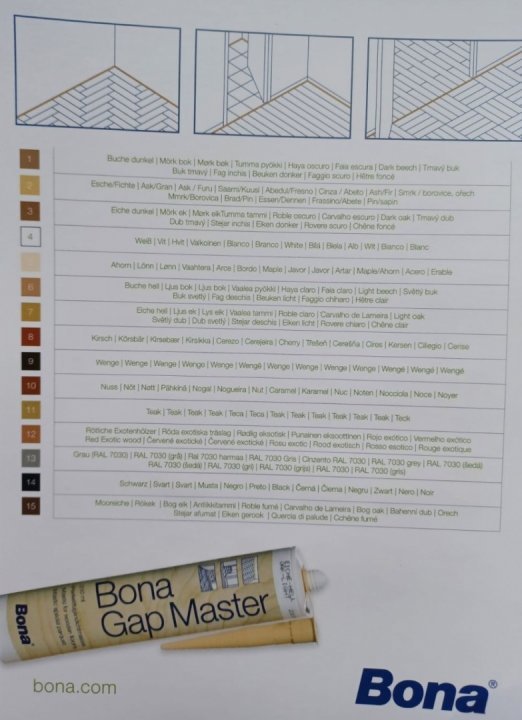 Bona Gap Master este un mastic acrilic, fara silicon, destinat acoperirii rosturilor dintre parchet si plinta sau tocul usilor. Deasemeni se poate folosi pentru repararea stricaciunilor survenite pe suprafata de parchet sau a crapaturilor din lamele de parchet. Masticul este disponibil in 15 culori si se poate acoperi cu toate finisajele Bona, dupa ce se usuca. Materialul este permanet elastic (15% toleranta maxima de miscare), nu miroase si nu contine solvent.