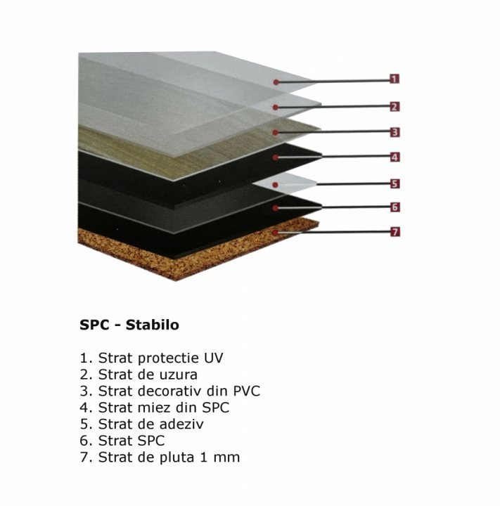 Parchetul vinil compozit SPC este realizat dintr-un material compozit inovativ ce ii ofera stabilitate mare in timp, durabilitate si rezistenta la umiditate si trafic ridicat.