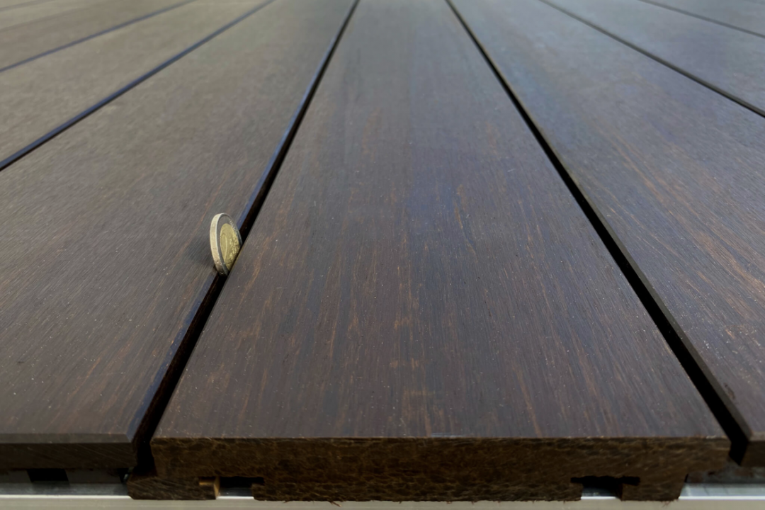 Placile deck-ului Exterpark din bambus, sistem instalare Magnet S, sunt prevazute cu un rost inchis, ce permite in acelasi timp o ventilatie corespunzatoare, prezentand mai multe avantaje :